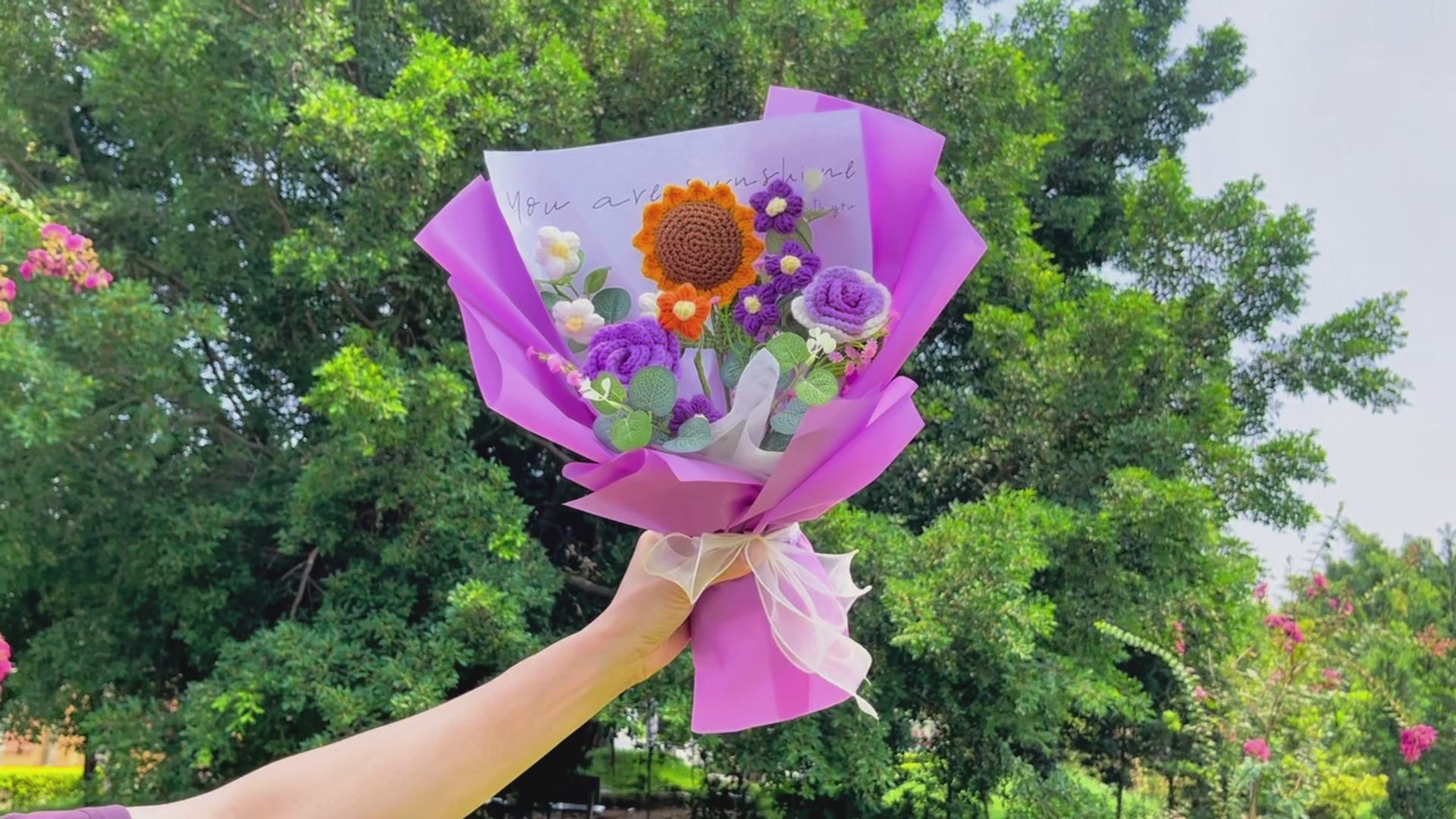 畢業成就:用這款鉤織花束慶祝您所愛之人的成就,象徵著成長、成功與新的開始。向日葵與鮮豔色彩的搭配代表著樂觀、熱情以及邁向人生新篇章的興奮。