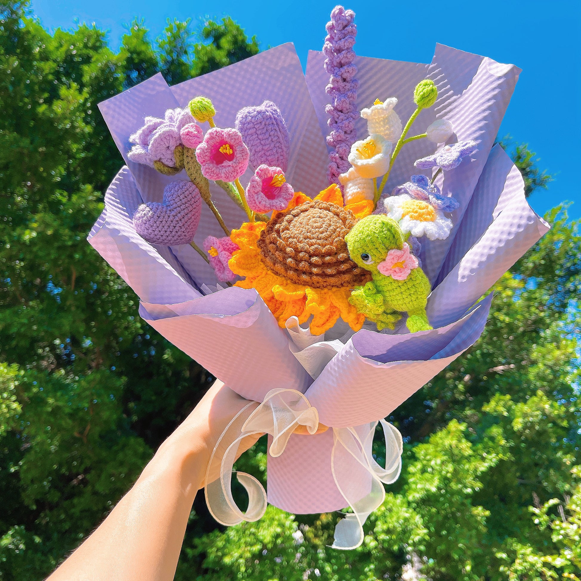 這款鉤織花束迷人且充滿活力,擁有一系列令人驚豔的花朵,定能俘獲您的感官。花束以多款高雅的花卉,展現自然之美,包括向日葵、薰衣草、百合、變色龍造型裝飾(註:若需避免歧義可表述為「附有變色龍造型配件」)、風鈴草、勿忘我、小菊、鬱金香和玫瑰。