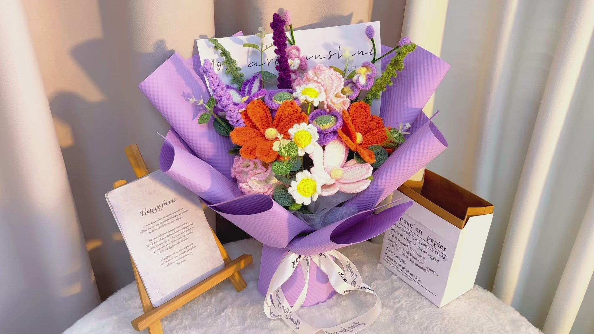 奢華手工鉤織花束:永不凋謝,無花粉的永恆之美用這束精心打造的鉤織花束,為任何空間注入永恆的優雅吧!它融合了多種令人驚豔的花朵:粉白康乃馨、紫白/粉白蘭花、紫色虞美人、紫白/橘色/粉白格桑花、淺/深綠色蕨葉、白色雛菊和淺/深紫色薰衣草。花束以精緻的淺紫色格紋紙包裝,完美捕捉了真實花朵令人屏息的美麗,同時100% 不過敏,是最適合愛花又對花粉敏感的你的選擇。