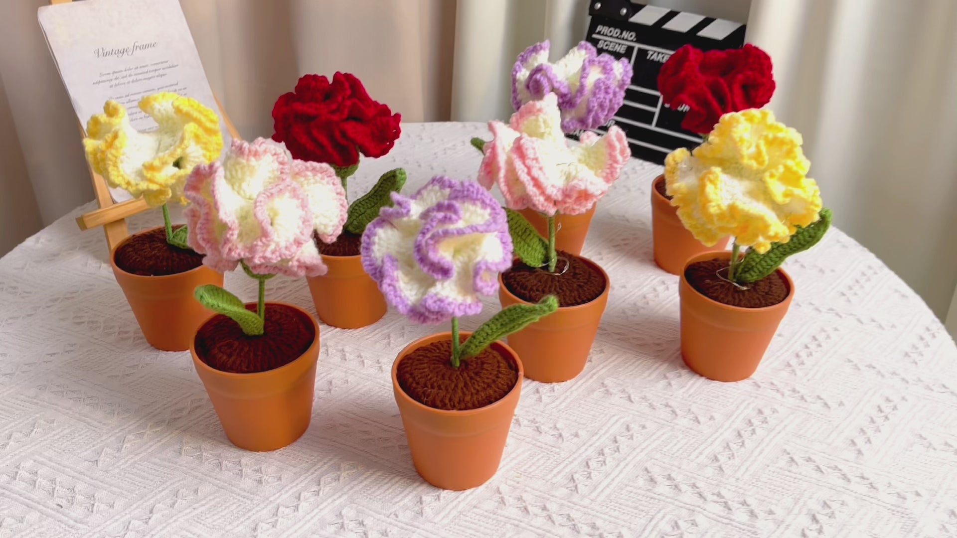 今天就把這手工鉤針編織的康乃馨盆栽帶回家,為您的家居裝飾增添一抹獨特風采,或是給某位特別的人一份獨一無二的驚喜禮物吧!