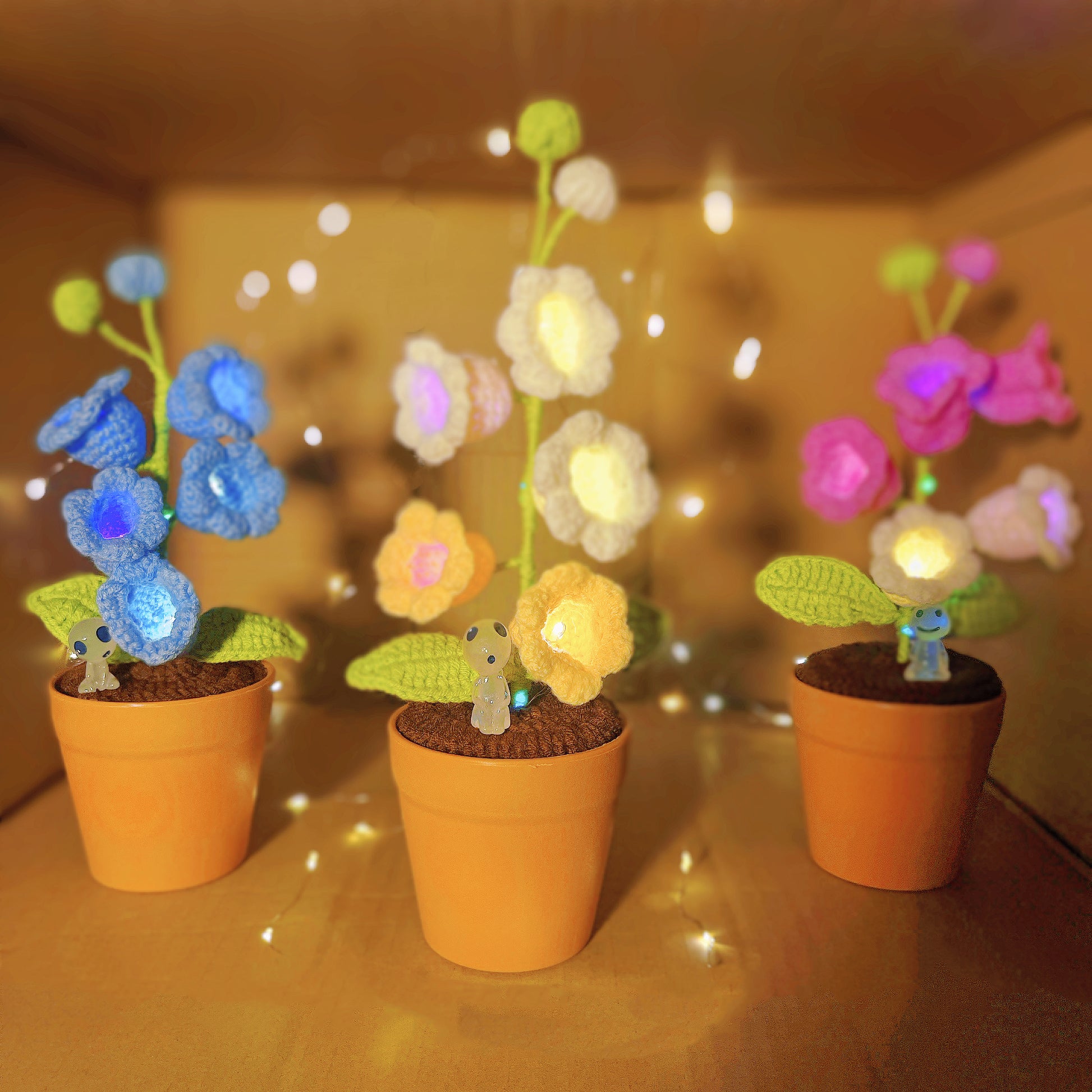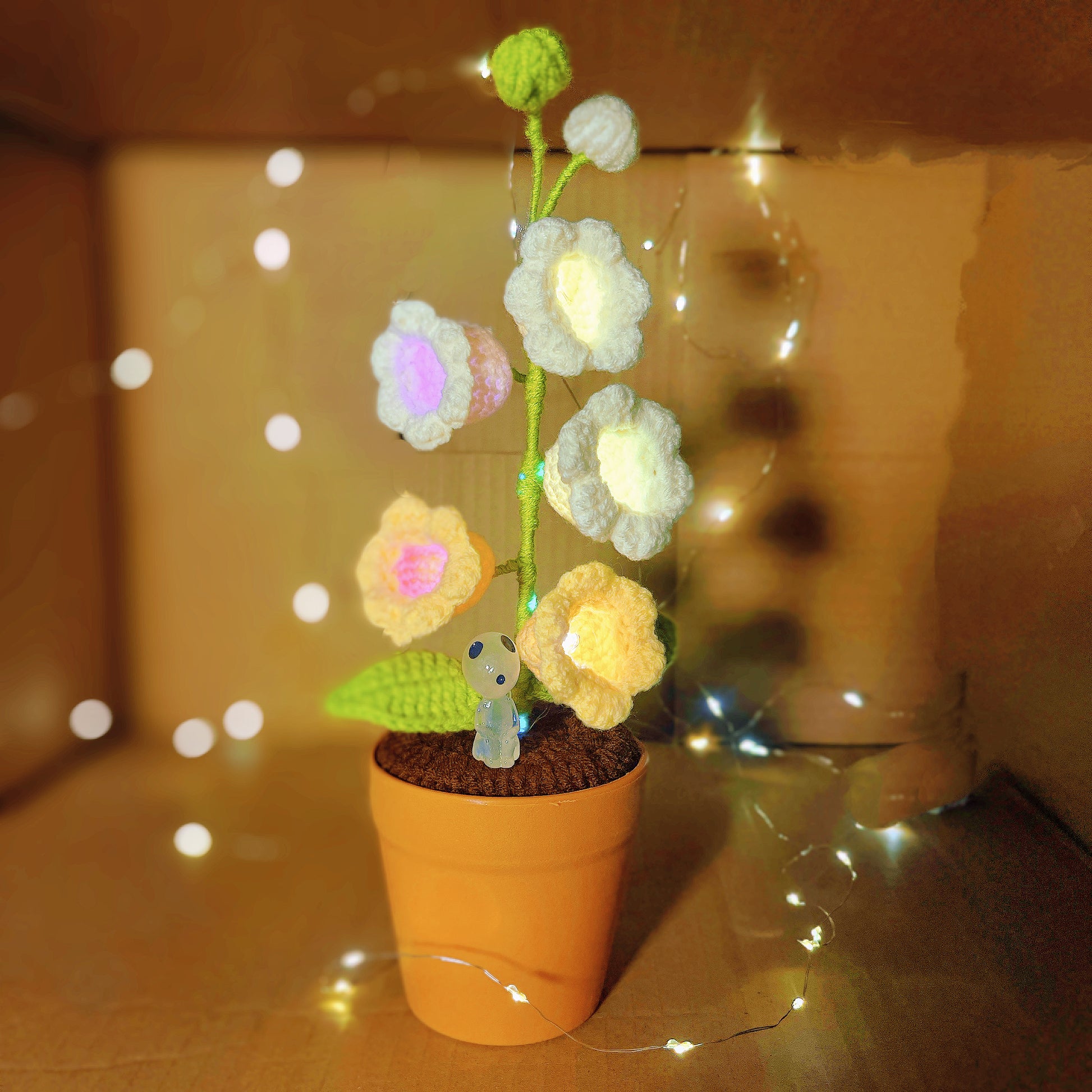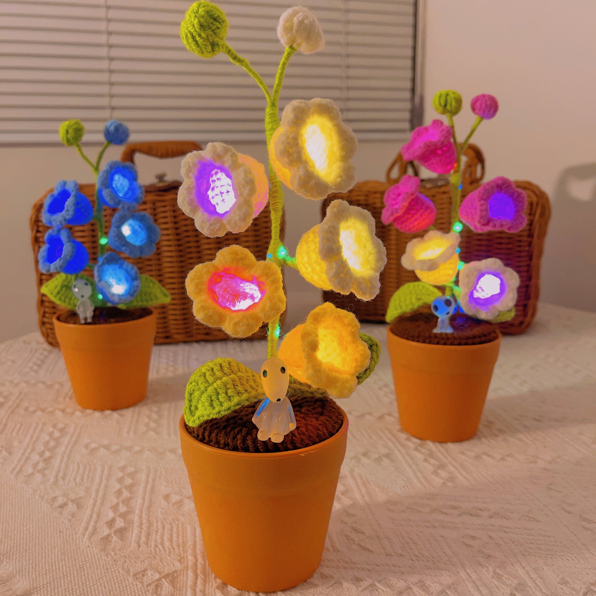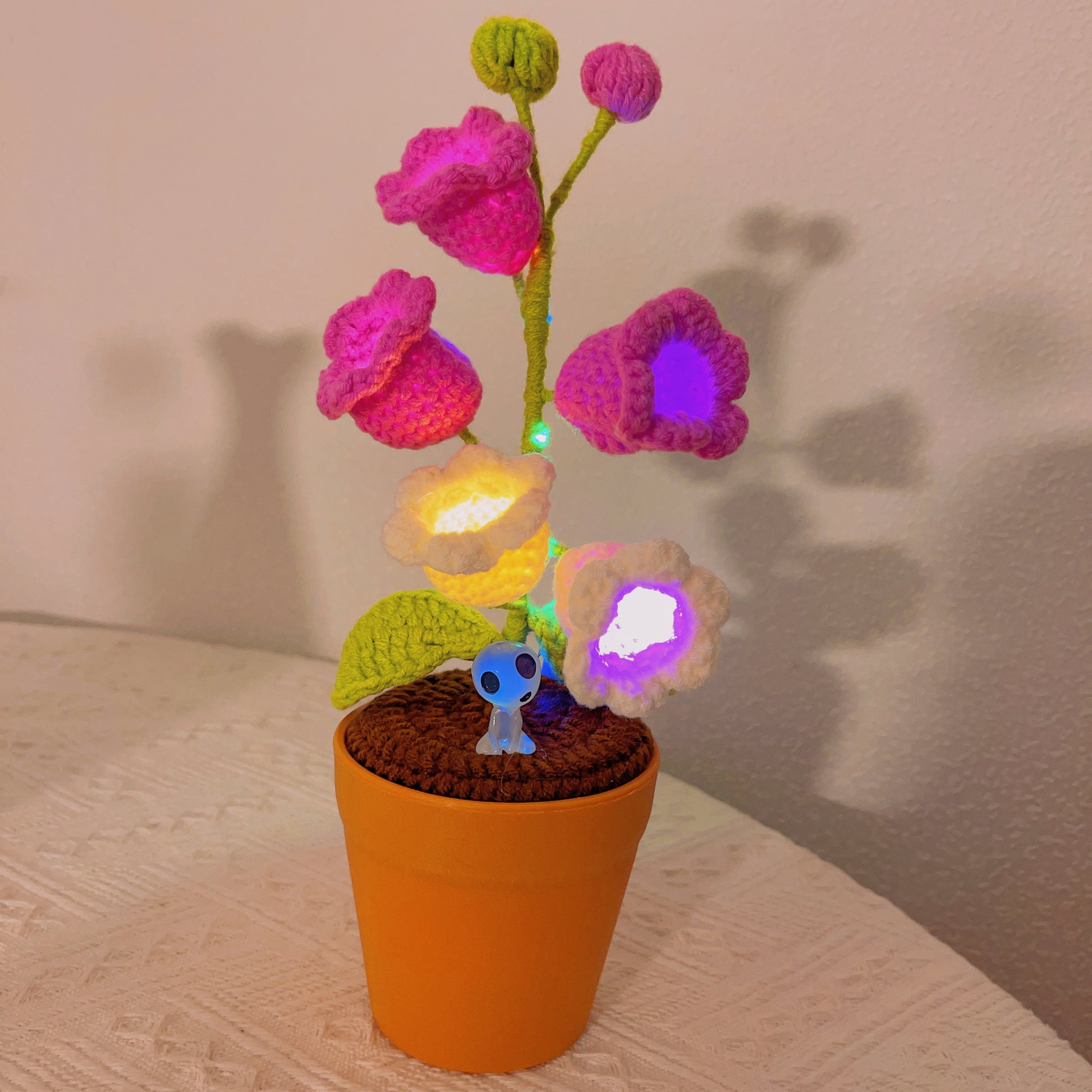手工絎鉤鈴蘭盆栽植物 - 發光LED花朵 - 獨特家居裝飾 - 植物愛好者的完美禮物 - 毛線手工精製