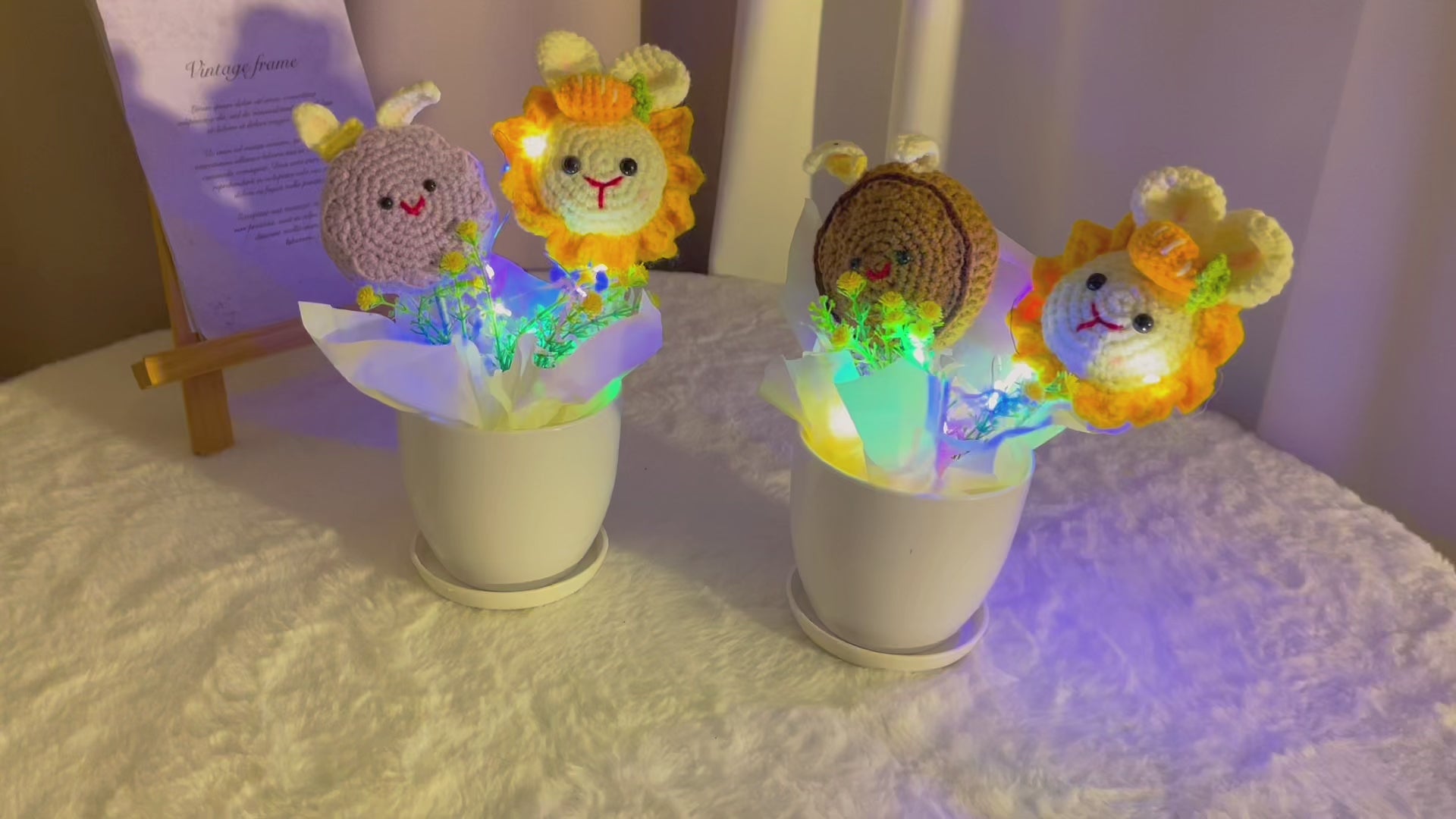 手工鉤織LED燈花盆擺飾 - 向日葵兔/紫棕雙兔造型,家居、庭園裝飾、暖房禮、母親節禮物首選
