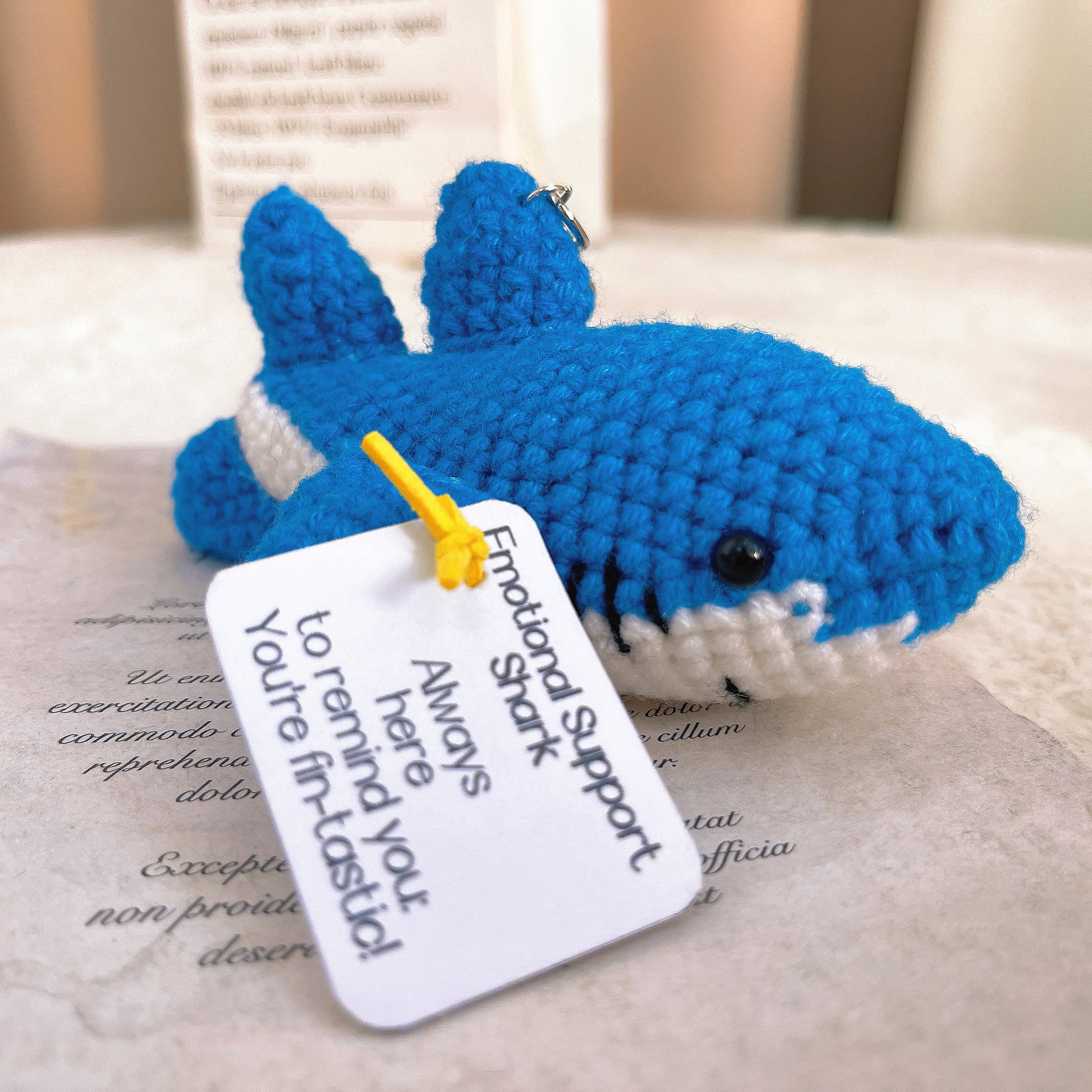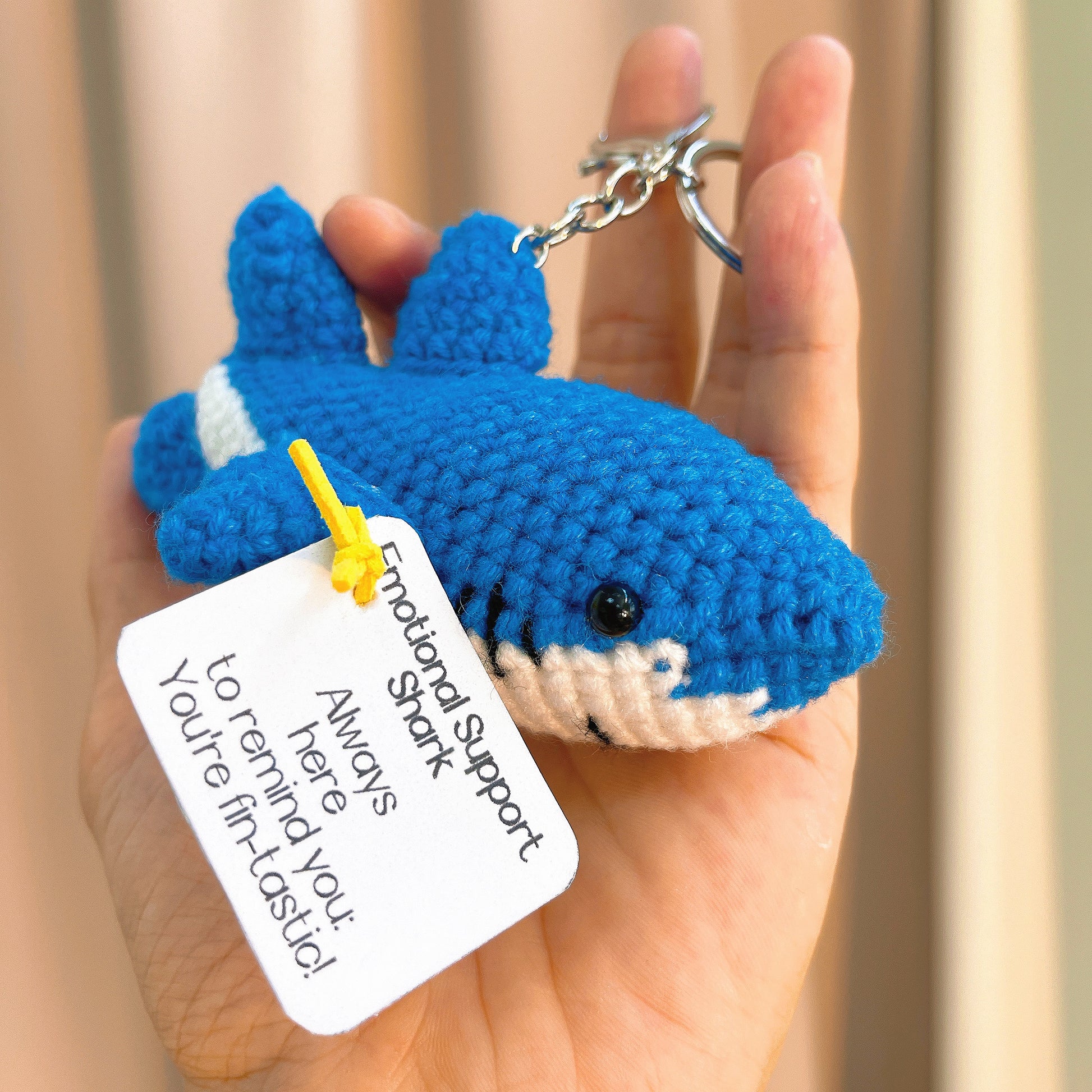 手工鉤針編織鯊魚鑰匙圈 - 淺藍白配色的情感支援小鯊魚,附可客製化訊息卡,低敏可愛禮物,紓解焦慮,適合朋友、孩童與鯊魚愛好者