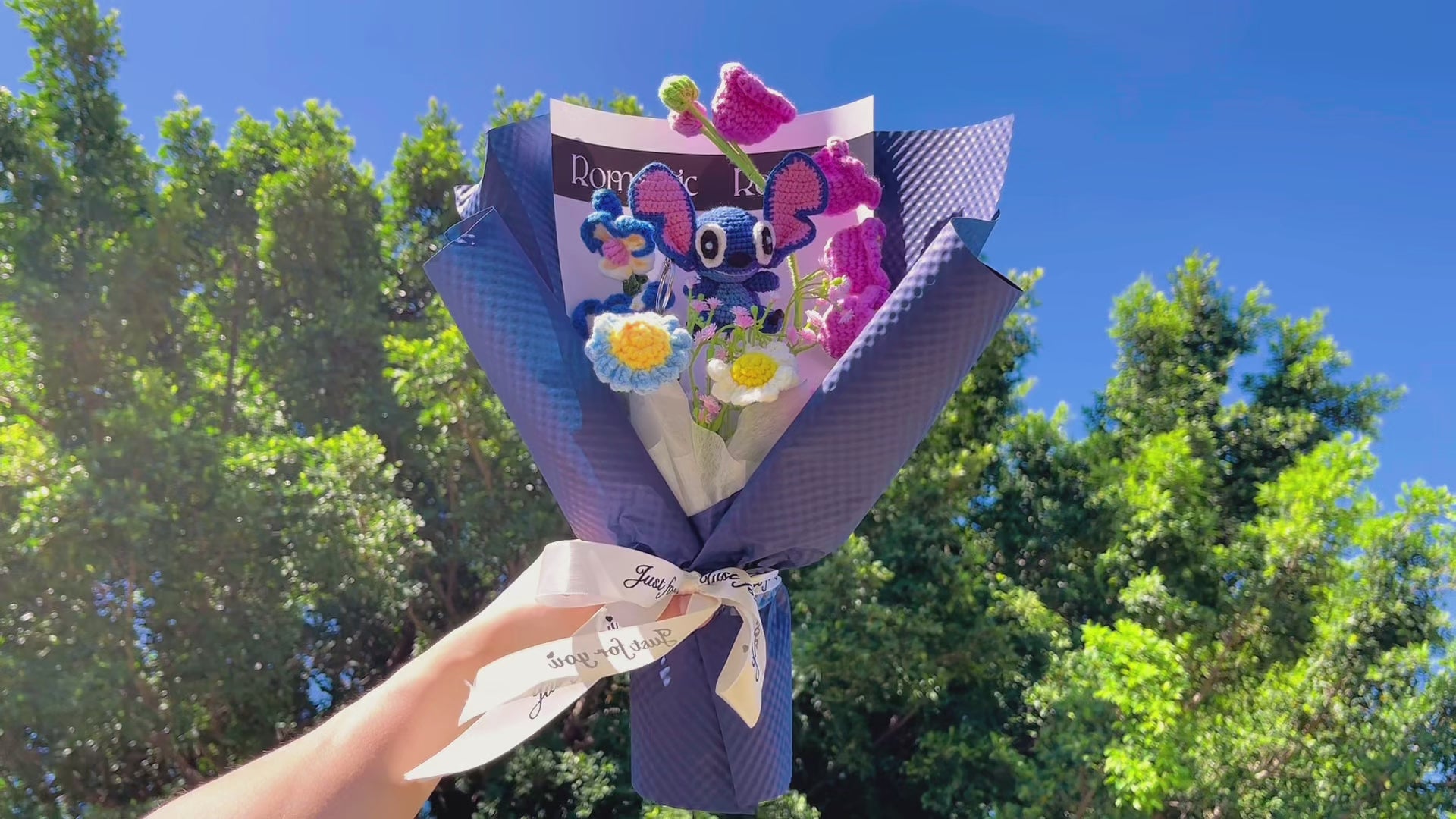 為您的特別時刻增添熱帶魅力與奇幻色彩!這款獨一無二的手工鉤針花束,將可愛到爆的史迪奇造型與柔和淡雅的花朵巧妙搭配,打造出既俏皮又充滿真心的禮物。