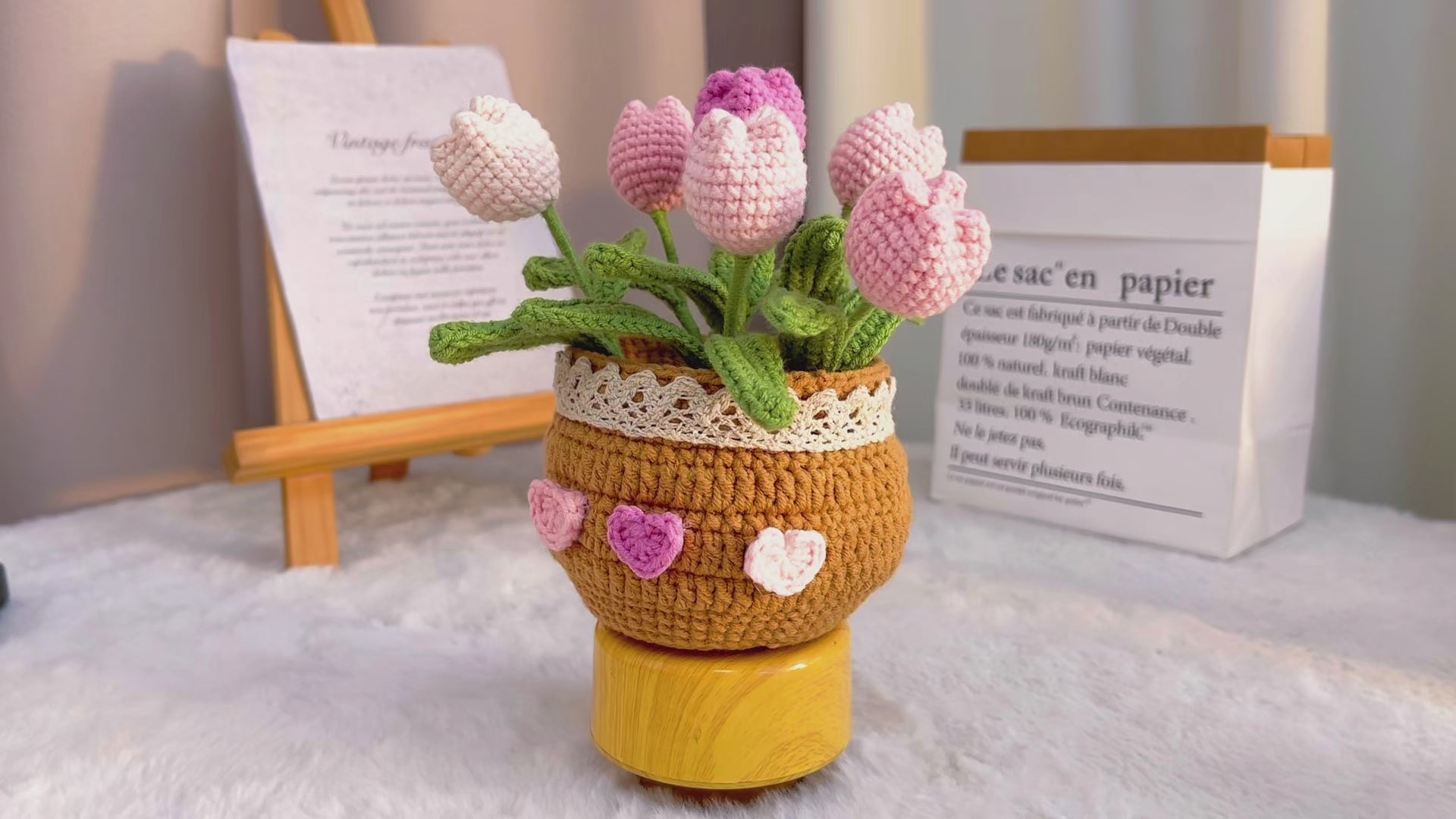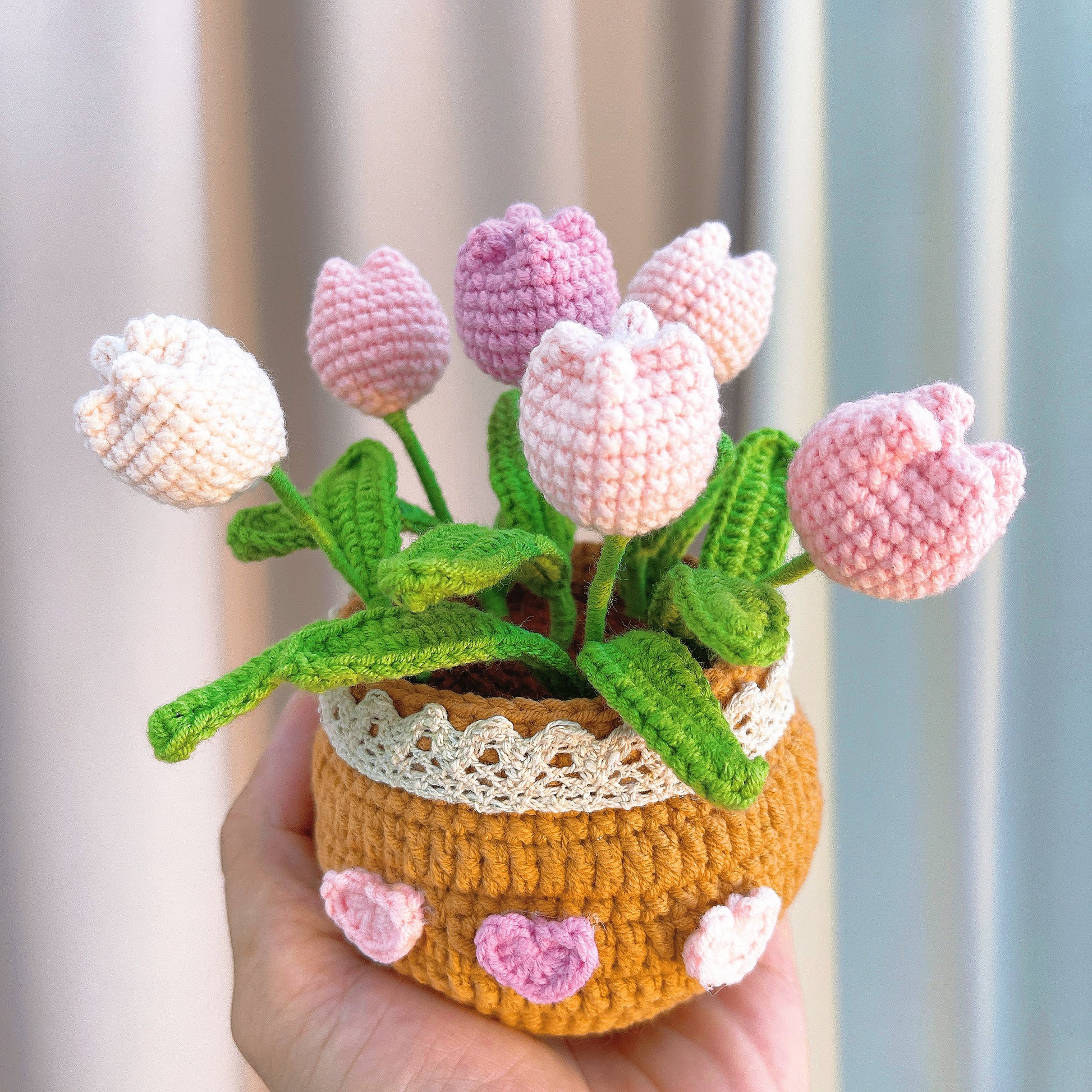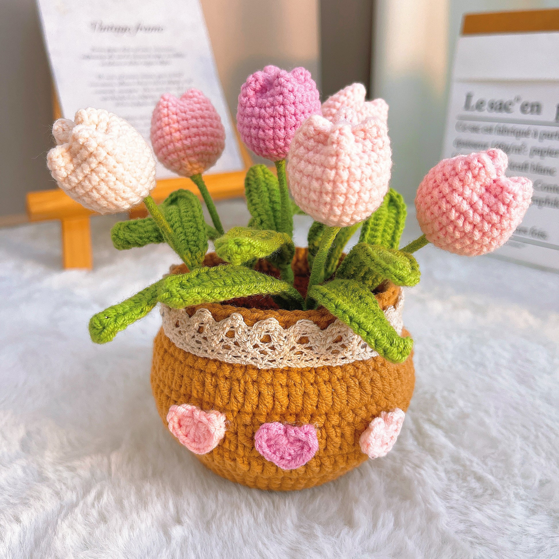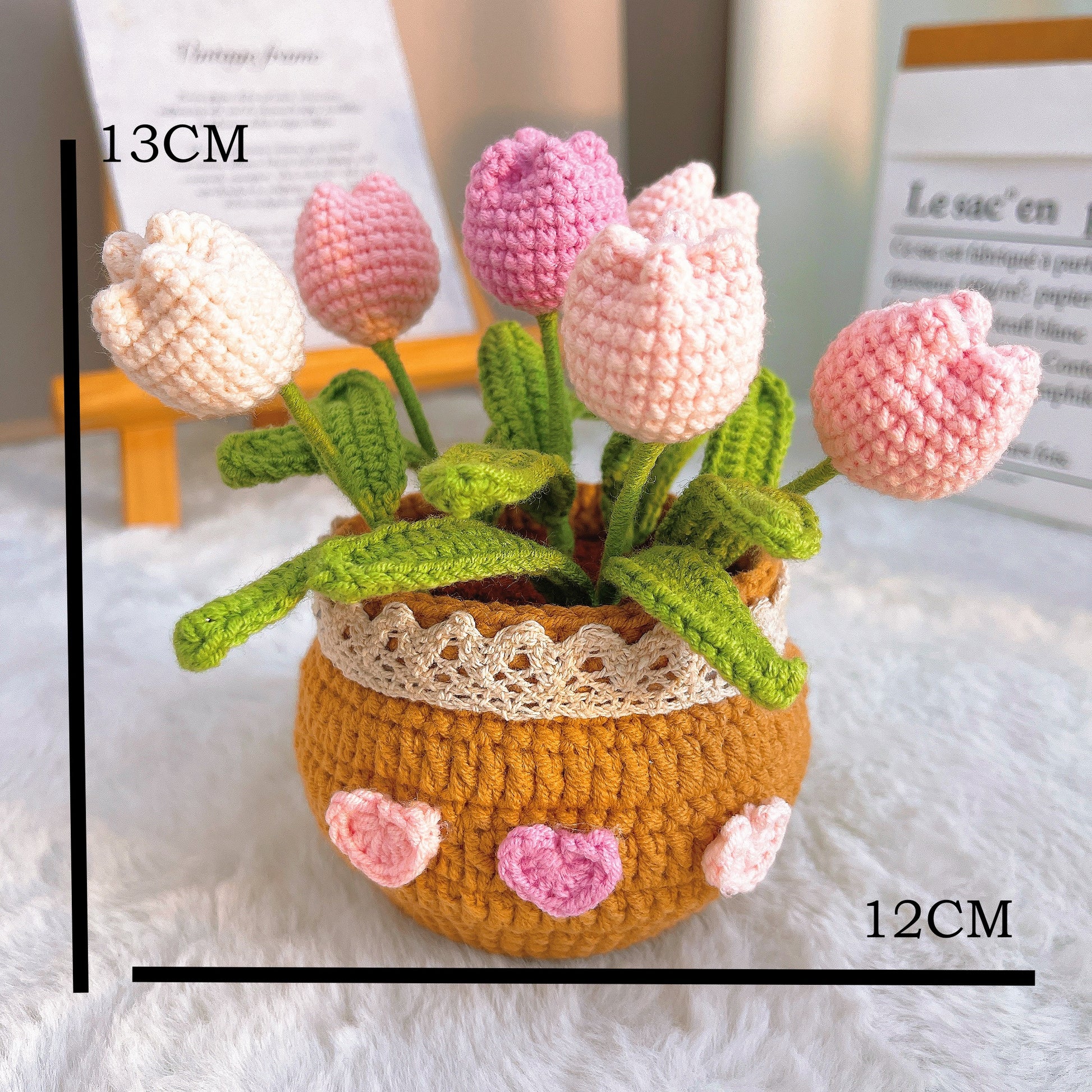 手工鉤針編織鬱金香花盆 - 低敏花卉家居裝飾 - 完美適合暖房派對、母親節及春季禮物