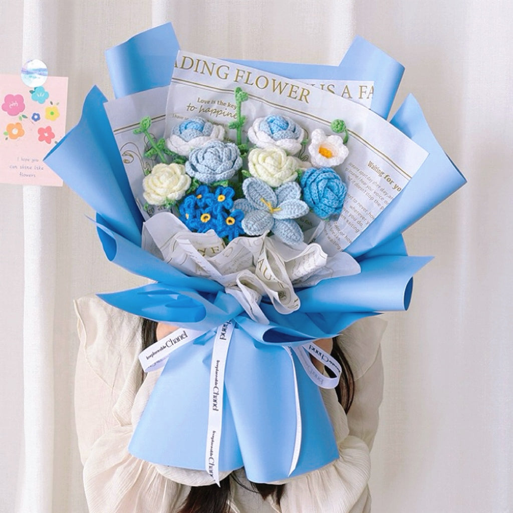 這款花束的舒緩藍色配色方案散發出一種平靜和安寧的感覺。 它非常適合任何特殊場合,可以作為結婚禮物、周年禮物或任何其他有意義的活動贈送。 這個手工編織的花束一定會給人留下深刻的印象。