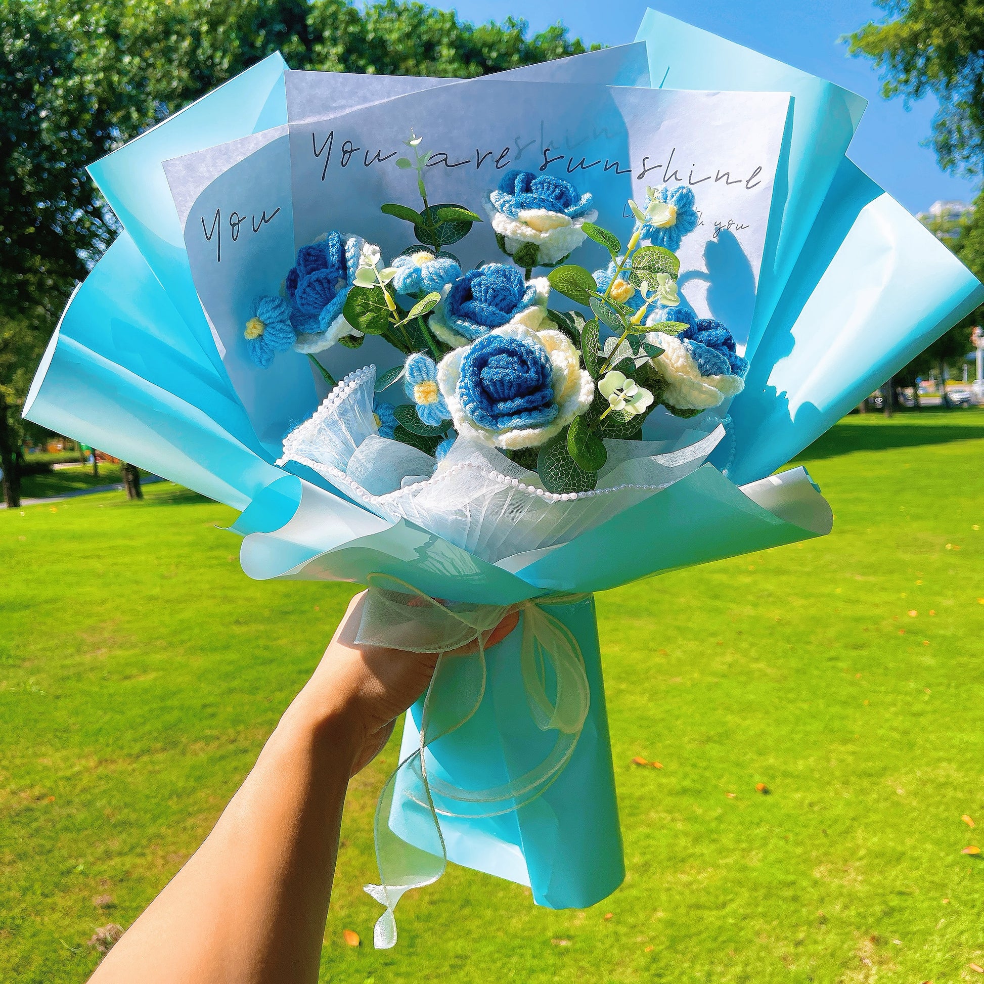 這束迷人花束以高品質毛線精心編織,中心綻放著一朵鮮豔的藍玫瑰,象徵著堅定不移的信念與忠誠。玫瑰旁點綴著俏皮的蓬鬆花,寓意著生活的歡愉與甜美。