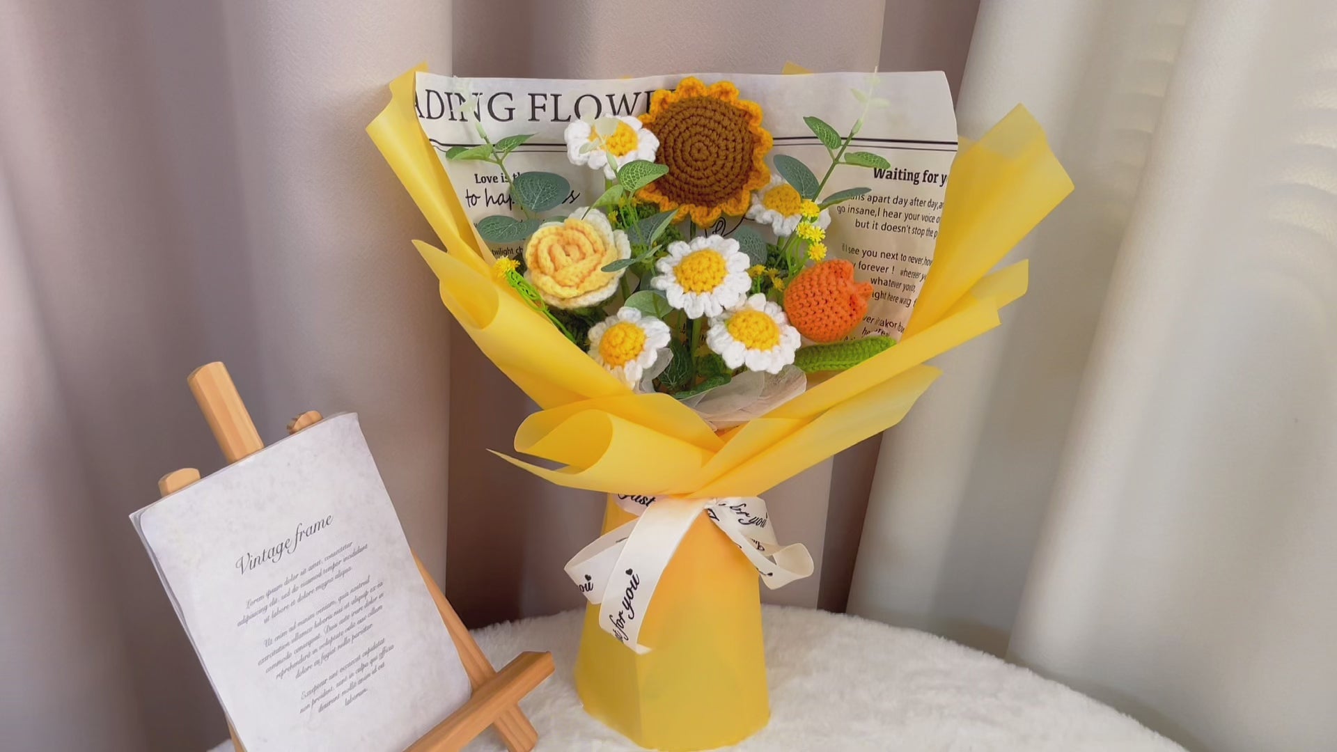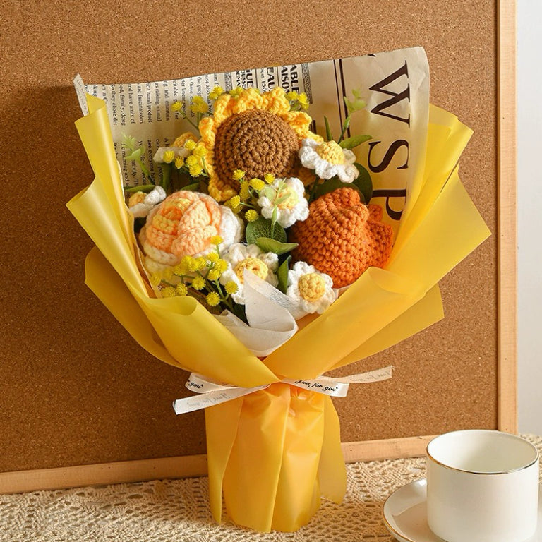 手工鉤針編織黃橙花束 - 向日葵、鬱金香、小雛菊、玫瑰繽紛組合