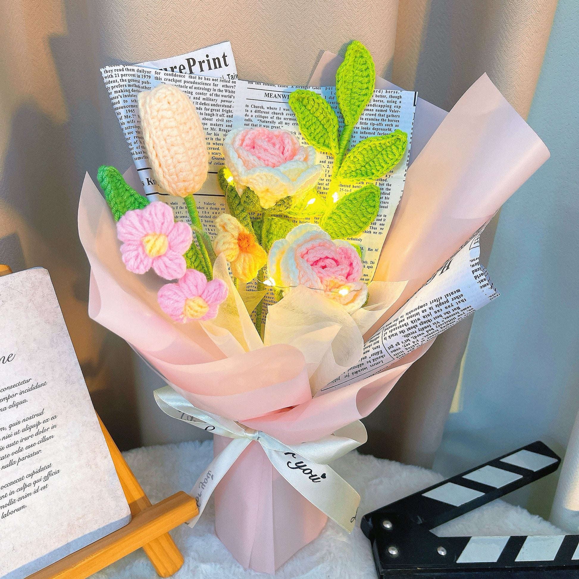 手工鉤針編織甜美柔粉玫瑰、鬱金香、小花束與綠葉花禮