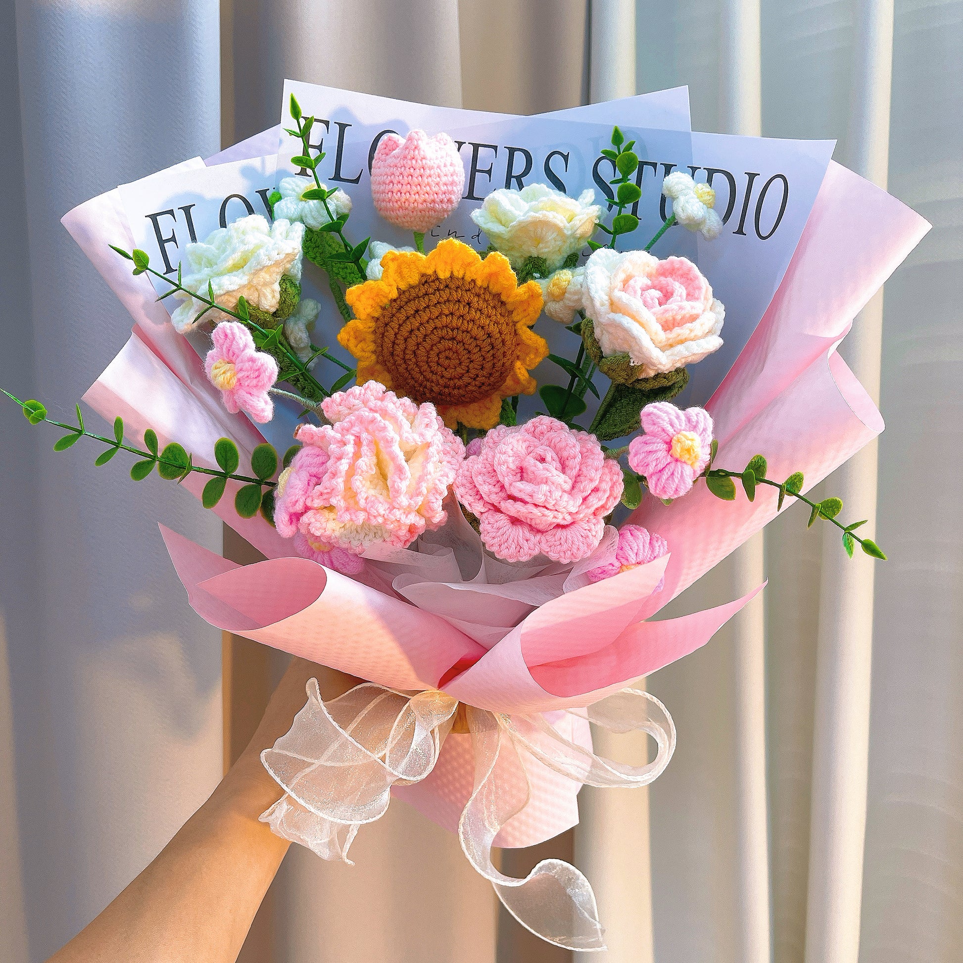 手工鉤針編織「花瓣悅語」花束:玫瑰、鬱金香、向日葵、小雛菊與康乃馨的柔美粉調交響