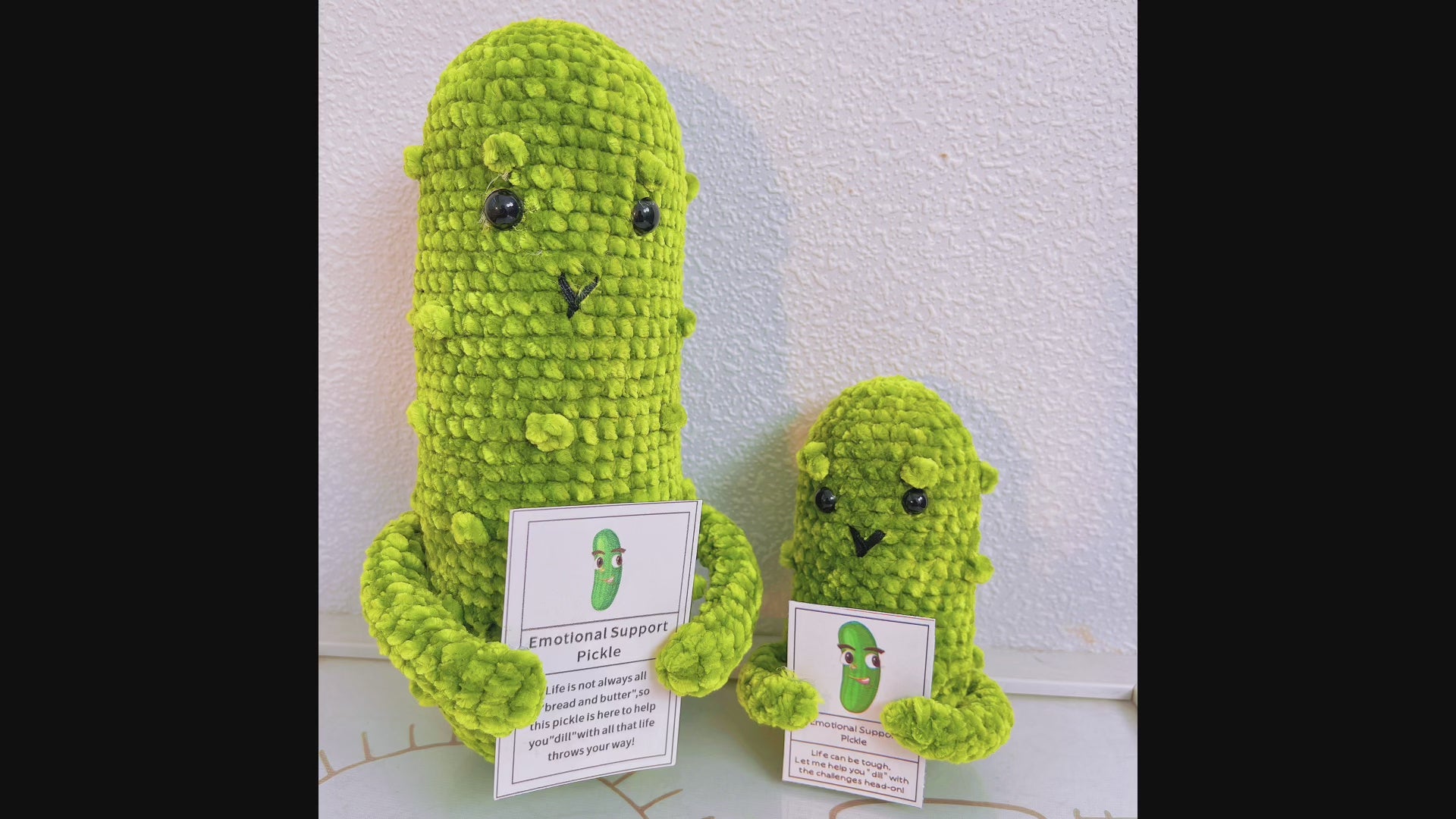 The smaller companion pickle (Pickle Pal and Dill Defender), conveniently sized to fit in the palm of your hand, serves as a steadfast ally on your journey. Take it with you wherever you go and draw strength from its comforting presence. Let this little pickle be a constant reminder that you can tackle challenges head-on and emerge victorious.